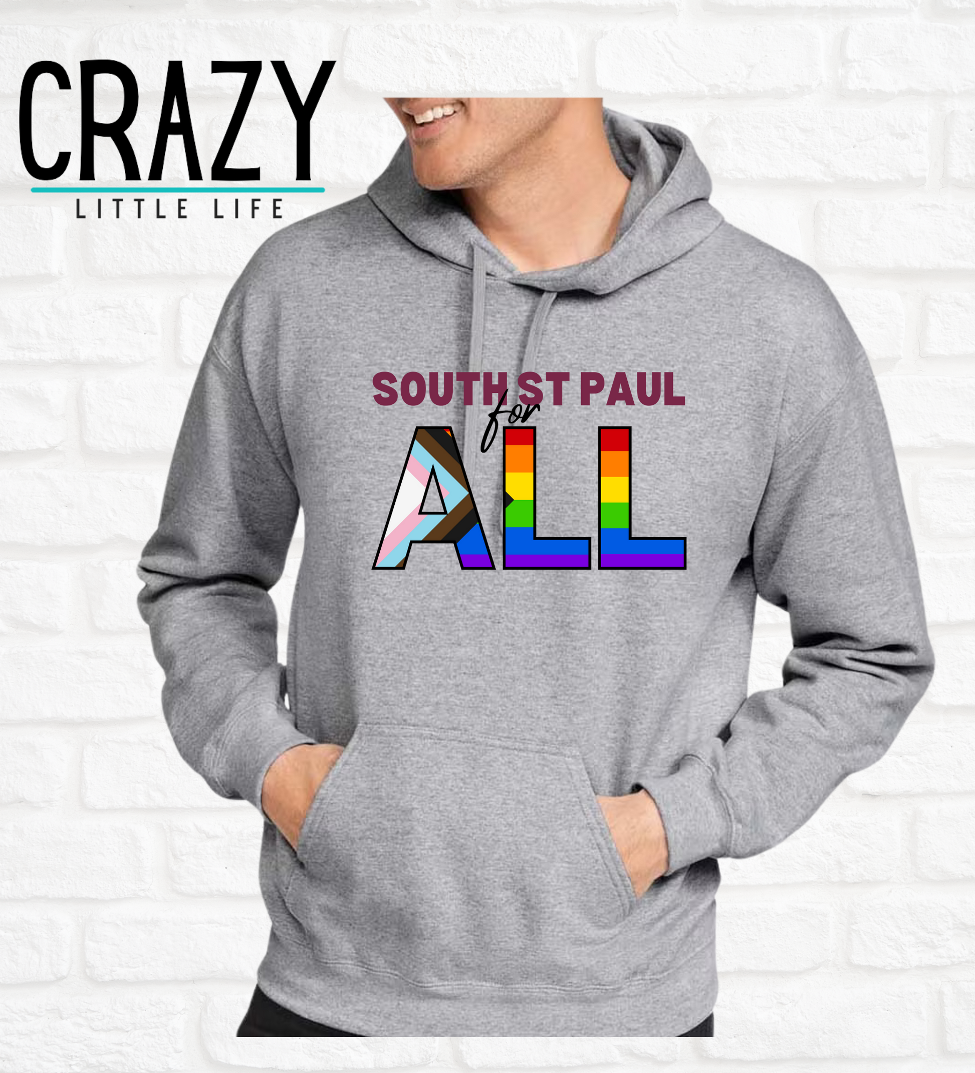Wrap yourself in comfort and inclusivity with the South St. Paul for ALL hoodie! Featuring a bold, pride-inspired design, this hoodie is perfect for showing your commitment to diversity and unity while staying cozy.